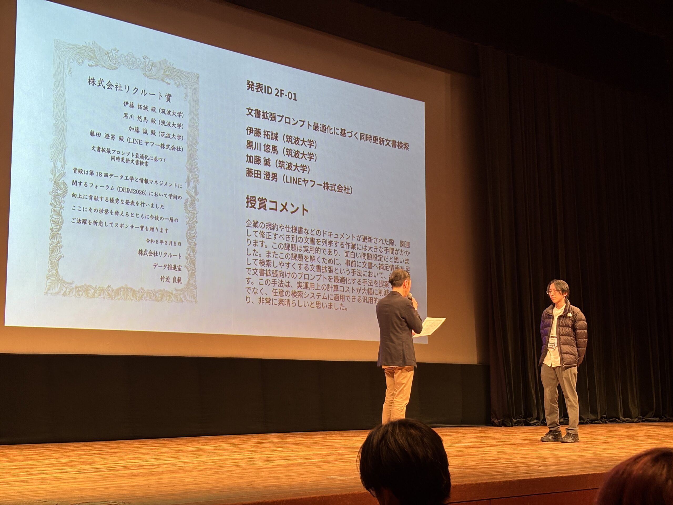 Takumi Ito (M2) received the Sponsor Award (Recruit Co., Ltd.) at DEIM 2026 (a domestic conference)! 👏👏👏 DEIM 2026(第18回データ工学と情報マネジメントに関するフォーラム)